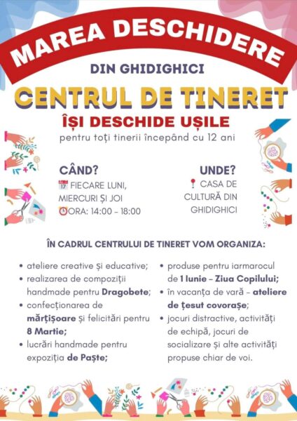 Dragi tineri din localitate, începând cu vârsta de 12 ani, vă așteptăm la Centrul de Tineret – un spațiu creat special pentru voi, unde puteți învăța lucruri noi, socializa și petrece timpul liber într-un mod distractiv și util 🎉