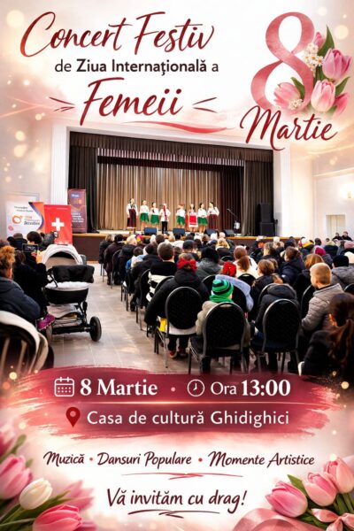 ➡️Primăria Ghidighici invită locuitorii și oaspeții localității la concertul festiv dedicat Zilei Internaționale a Femeii, care va avea loc la data de 8 martie, începând cu ora 13:00.